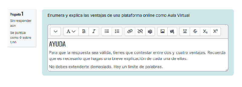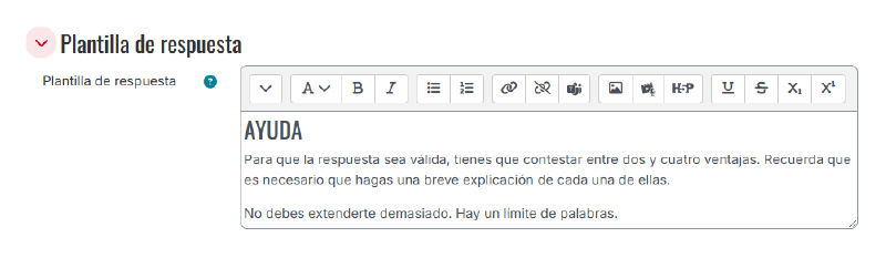 La Plantilla de respuesta es un texto con una ayuda inicial en el que puedes indicar al estudiantado cualquier observación que les ayude a responder a la pregunta. El estudiante o la estudiante puede contestar a continuación de este texto de plantilla o borrarlo antes de enviar el intento de examen.