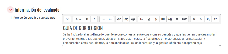 Es un texto que apoyo para el profesorado que tiene que corregir la pregunta. Sirve para saber qué información tiene que contestar el estudiantado para que su respuesta pueda ser considerada como correcta. Este texto no visible para el estudiante en ningún caso.
