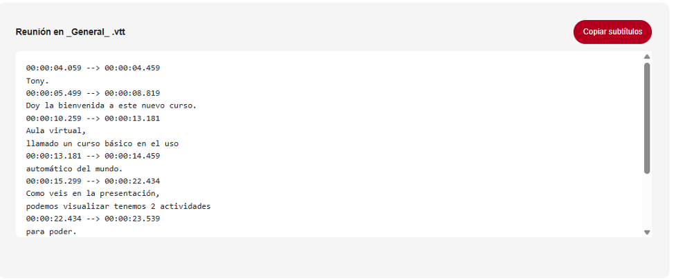 Como se ha comentado anteriormente, las grabaciones realizadas desde los Equipos de Teams de las asignaturas se almacenan en Microsoft Stream y este genera un archivo de transcripción que puedes descargar para incluirlo posteriormente como archivo de subtítulos en TV-URJC.